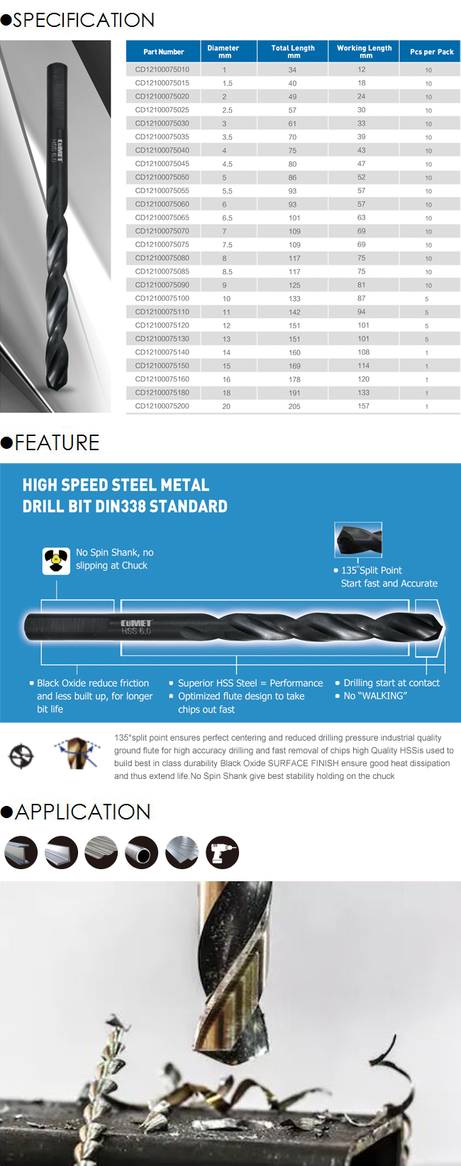 ITEM NO.: Hss Drill Bit 135° split point